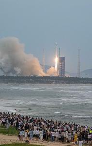 (250804) -- WENCHANG, 4 agosto, 2025 (Xinhua) -- Un cohete portador Gran Marcha-12 transportando un grupo de satélites de internet,...