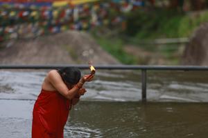 (250804) -- KATMANDU, 4 agosto, 2025 (Xinhua) -- Una devota ofrece oraciones durante el peregrinaje Bol Bom, en Katmandú, Nepal,...