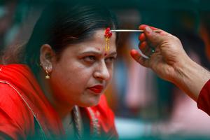 (250729) -- KATMANDU, 29 julio, 2025 (Xinhua) -- Una devota recibe un tika en la frente durante la celebración del...