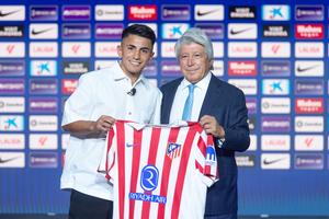 (250729) -- MADRID, 29 julio, 2025 (Xinhua) -- Thiago Almada (i) y Enrique Cerezo, presidente de Atlético de Madrid, posan...