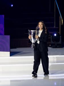 (250729) -- SIDNEY, 29 julio, 2025 (Xinhua) -- Li Mengwen, de China, devuelve el trofeo durante el sorteo final de...