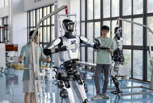 (250725) -- QUANZHOU, 25 julio, 2025 (Xinhua) -- Imagen del 24 de julio de 2025 de trabajadores depurando robots humanoides,...