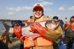 (260131) -- TAIZHOU, 31 enero, 2026 (Xinhua) -- Una visitante muestra un pescado recién capturado durante un evento de pesca...