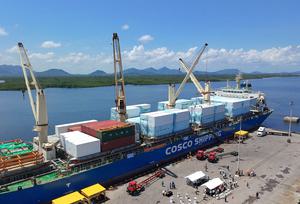 (250522) -- SAN LORENZO, 22 mayo, 2025 (Xinhua) -- Imagen del 20 de mayo de 2025 de trabajadores portuarios descargando...