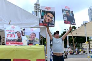 (250512) -- TEL AVIV, 12 mayo, 2025 (Xinhua) -- Personas esperan para observar una transmisión en vivo de la liberación...