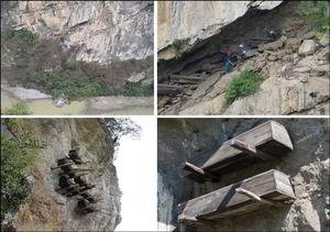 (251124) -- KUNMING, 24 noviembre, 2025 (Xinhua) -- Imagen de archivo combinada de los restos de los ataúdes colgantes encontrados...