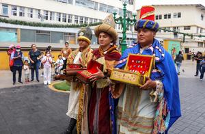 (260105) -- LIMA, 5 enero, 2026 (Xinhua) -- Integrantes de la Unidad Histórica de la Policía Montada-Potao, disfrazados de Los...